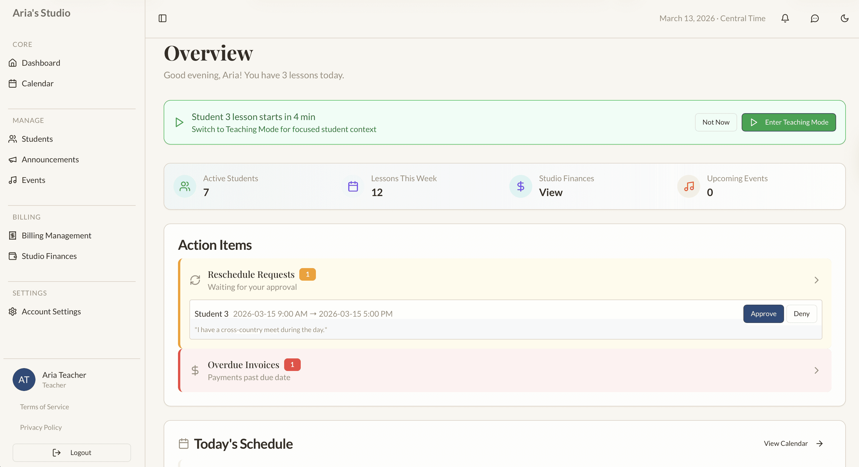 Experience a workspace that adapts to your needs in real time. Our context-aware dashboard shifts between "Planning Mode" for admin tasks and "Teaching Mode" as your lessons approach. It clears away the business clutter when you’re teaching, surfacing only the student’s profile, lesson goals, and tools exactly when you need them.